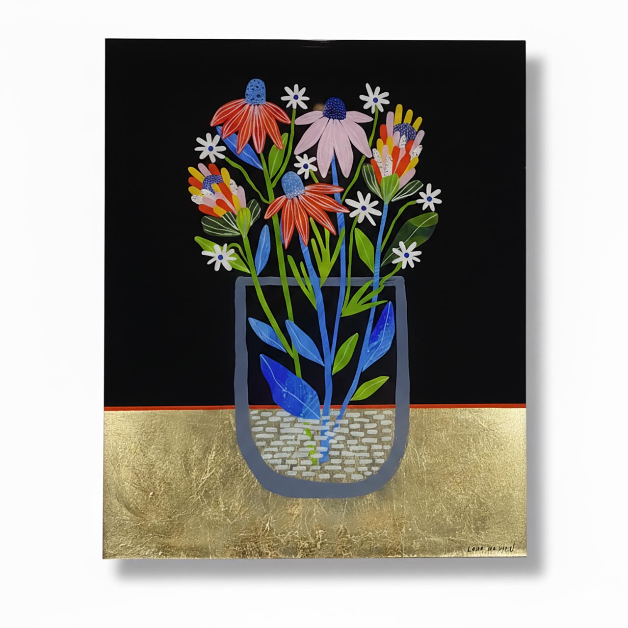 This vibrant collage is a combination of mixed media, including hand-cut and colored paper with alcohol ink, as well as textured gold paint on premium wood panels. Sealed with a glossy resin coating, the artwork is protected while achieving a luminous finish that enhances the vibrancy of the piece, also giving it a sleek and modern aesthetic.