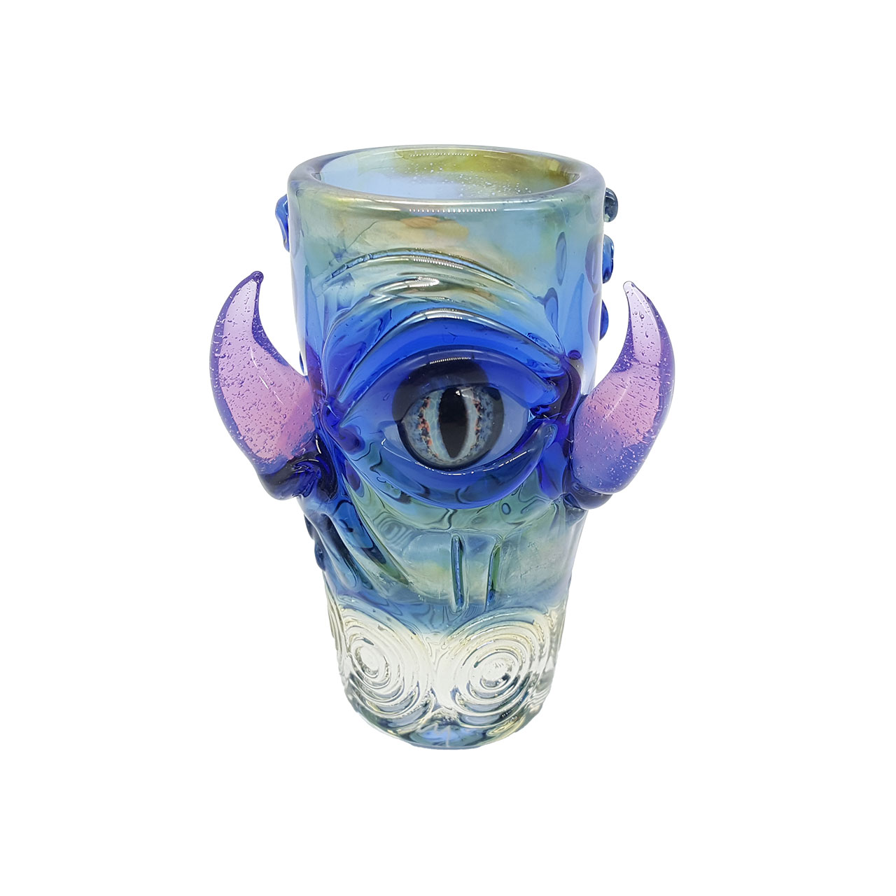 Created with heated glass in a multi-step process by artist Eli Mazet. Each glass is vibrantly colored with many thrilling minute details sure to be a conversational piece in any barware collection.