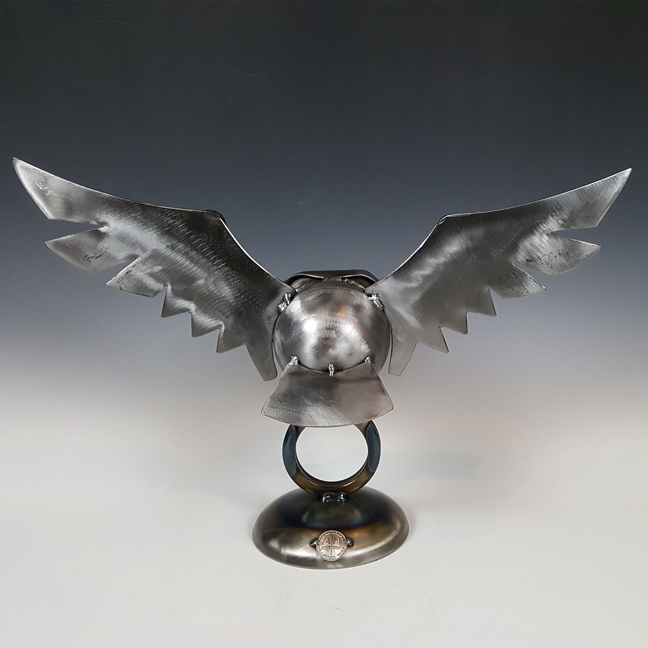 Graceful and bold, this striking metal sculpture features a small owl perched on a circular ring, captured mid-moment with an impressively wide wingspan. Crafted from metal and steel, the piece blends strength and elegance, highlighting the owl’s watchful presence and symbolic wisdom. A perfect accent for shelves, desks, or modern art displays, this sculpture brings a touch of the wild into any space.