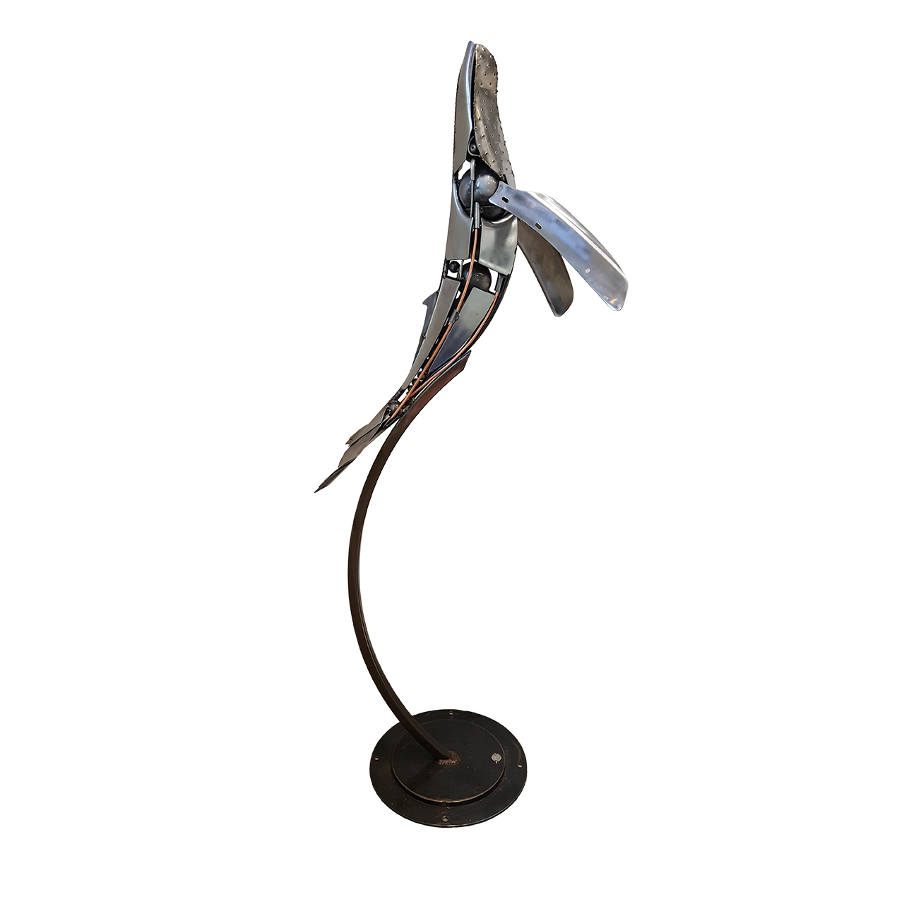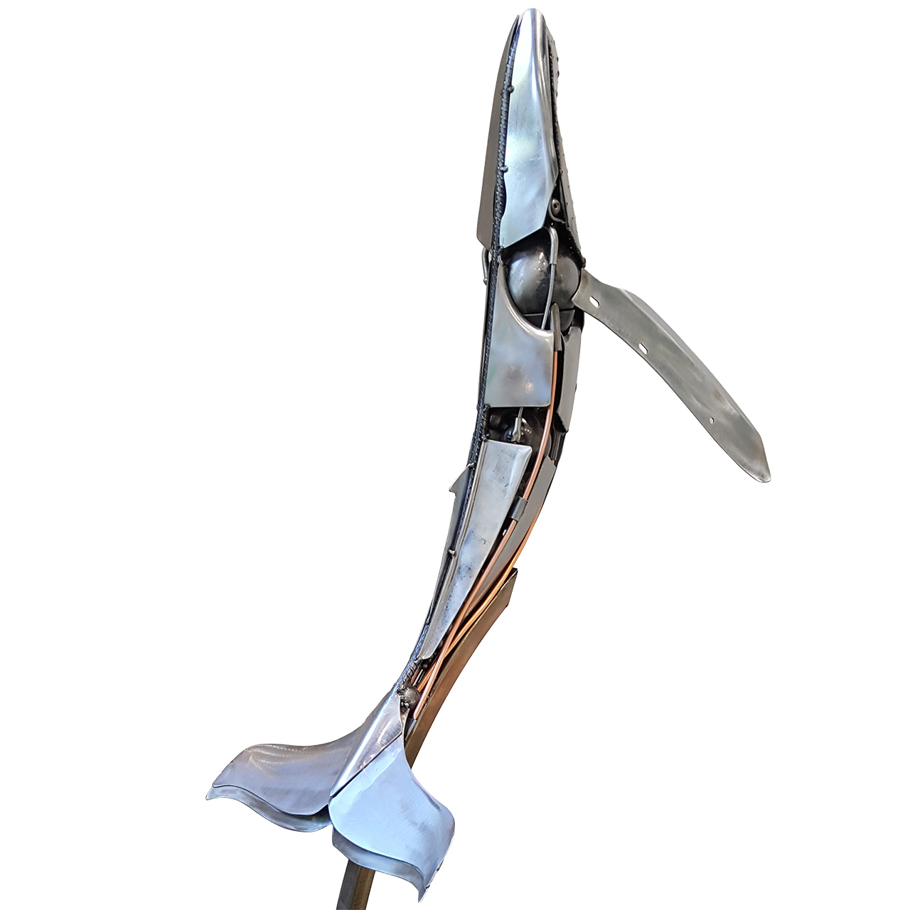 This magnificent sculpture is a striking testament to the power of transformation, finding organic beauty within industrial components. Crafted with remarkable skill from polished and patinated metals, sleek sheet metal, and delicate copper accents, this piece captures the awe-inspiring form of a whale in full, dynamic motion. The artist has ingeniously utilized the contours and textures of repurposed materials to evoke the smooth, powerful lines of a leviathan slicing through water.