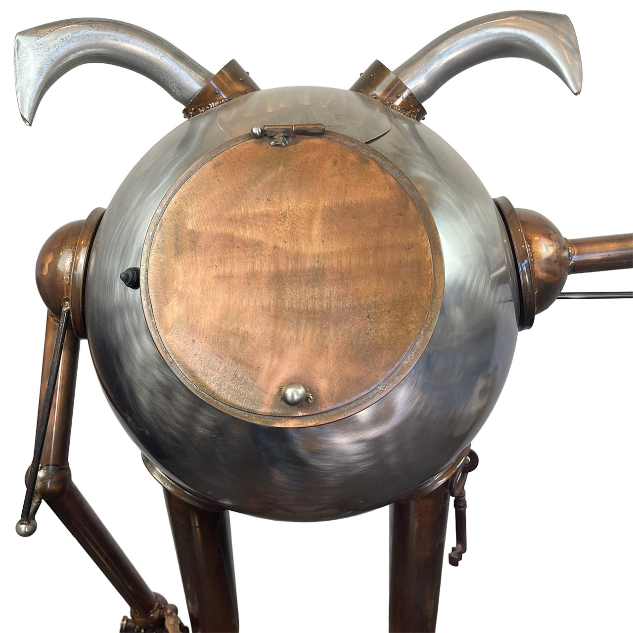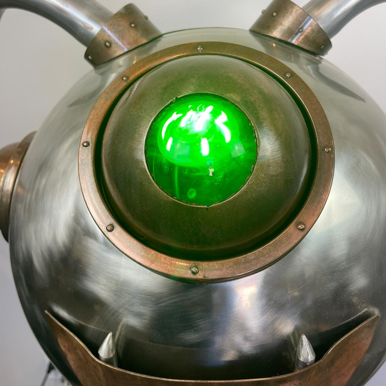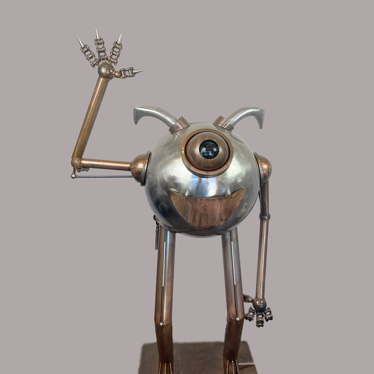Meet our resident monster, a personality-filled creation that blurs the lines between sculpture and kinetic art. Crafted from an intriguing selection of polished and patinated metals, this piece presents a wonderfully approachable character with its round form and singular, expressive eye. What truly sets this monster apart are its interactive elements: a vibrant, glowing LED eye pierces through its metallic facade, and its right arm, tipped with whimsical spikes, performs an inviting wave. Each of these captivating actions—the eye's glow and the arm's movement—can be independently controlled by the viewer. The color of the eye can be changed by switching the lightbulb accessed in the back of the monster's head. Designed for easy display, the piece plugs into any standard electrical outlet, ready to bring a spark of animated charm and playful engagement to any space.