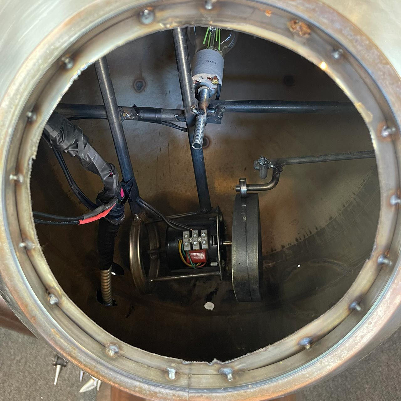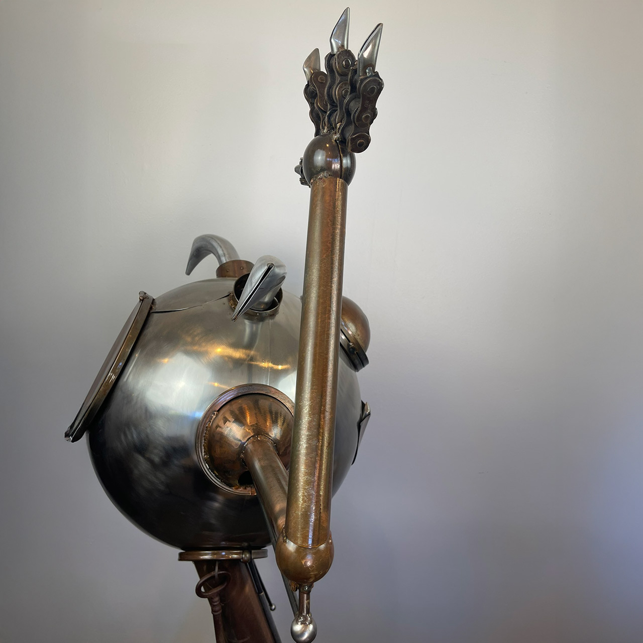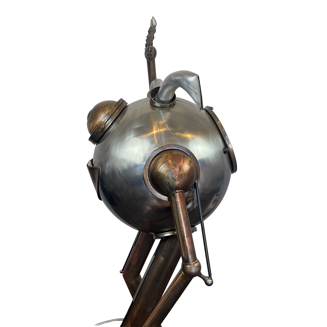Meet our resident monster, a personality-filled creation that blurs the lines between sculpture and kinetic art. Crafted from an intriguing selection of polished and patinated metals, this piece presents a wonderfully approachable character with its round form and singular, expressive eye. What truly sets this monster apart are its interactive elements: a vibrant, glowing LED eye pierces through its metallic facade, and its right arm, tipped with whimsical spikes, performs an inviting wave. Each of these captivating actions—the eye's glow and the arm's movement—can be independently controlled by the viewer. The color of the eye can be changed by switching the lightbulb accessed in the back of the monster's head. Designed for easy display, the piece plugs into any standard electrical outlet, ready to bring a spark of animated charm and playful engagement to any space.
