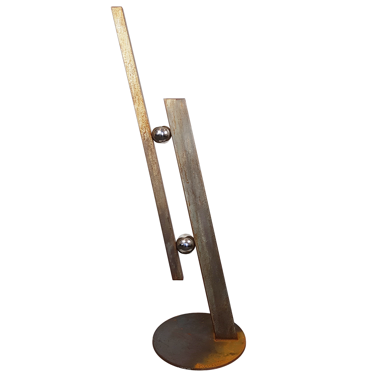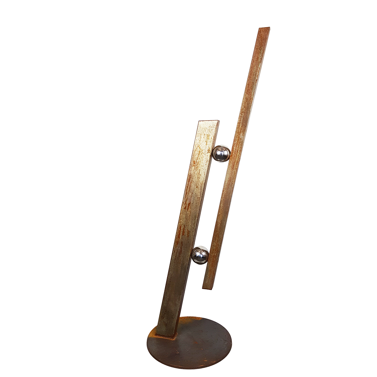 The titular parallel paths are broken only by two highly polished steel spheres, which seem to defy gravity, acting as dynamic links between the static planes. These spheres introduce a palpable sense of tension and movement, suggesting that even when paths run alongside one another, moments of interaction and connection are inevitable. Anchored by a heavy, rusted circular base, Parallel Paths is a profound study in material juxtaposition and formal economy, inviting viewers to reflect on the unseen forces that bind separate elements together.