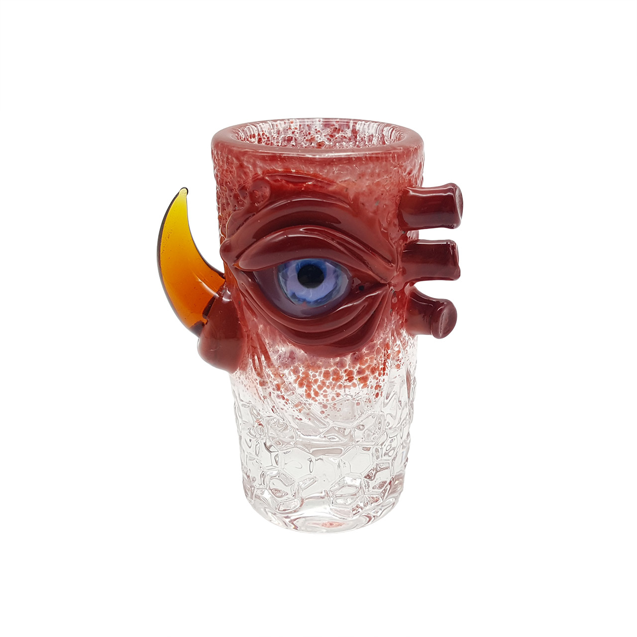 Created with heated glass in a multi-step process by artist Eli Mazet. Each glass is vibrantly colored with many thrilling minute details sure to be a conversational piece in any barware collection.