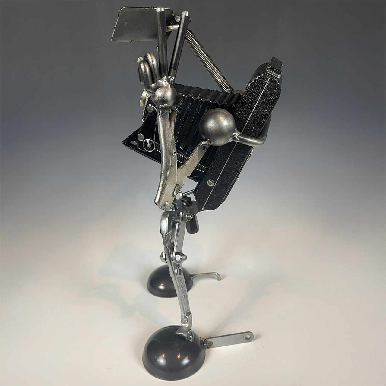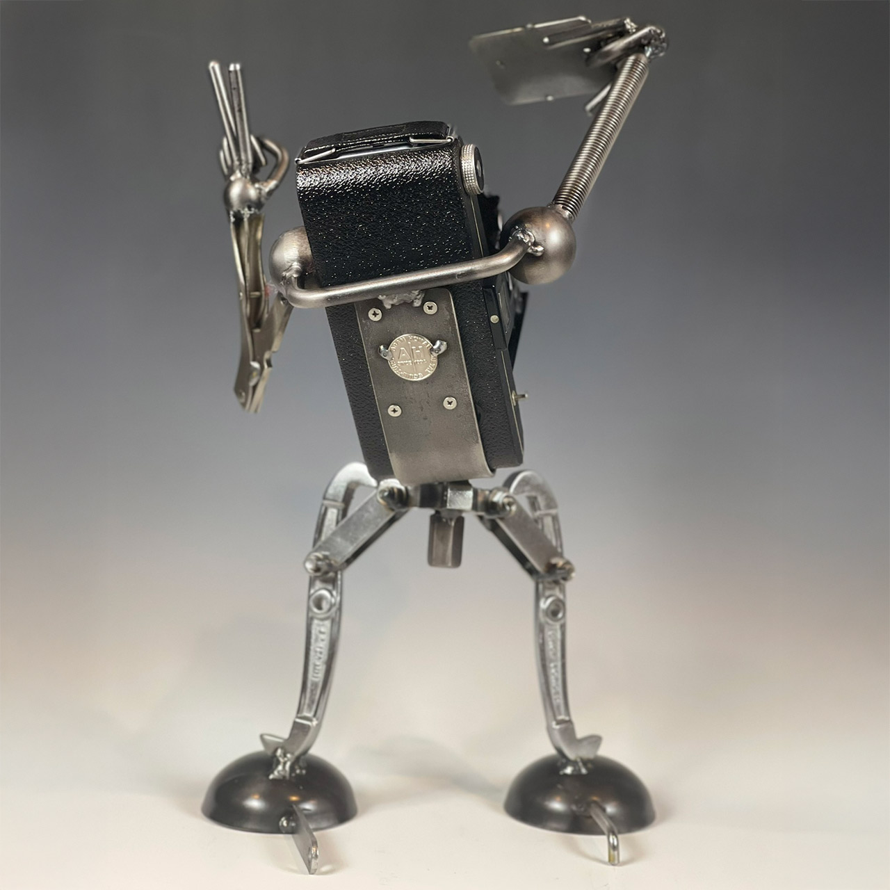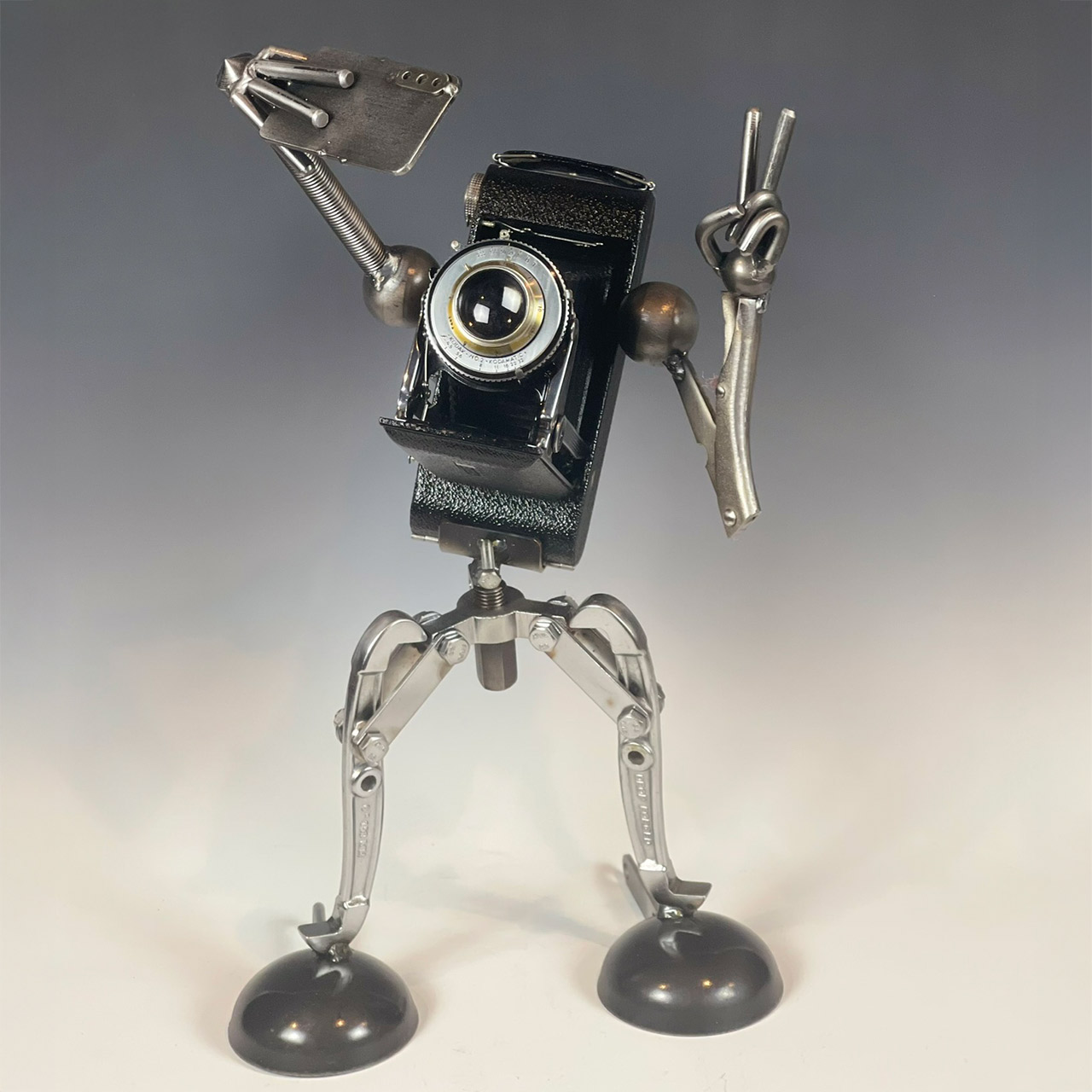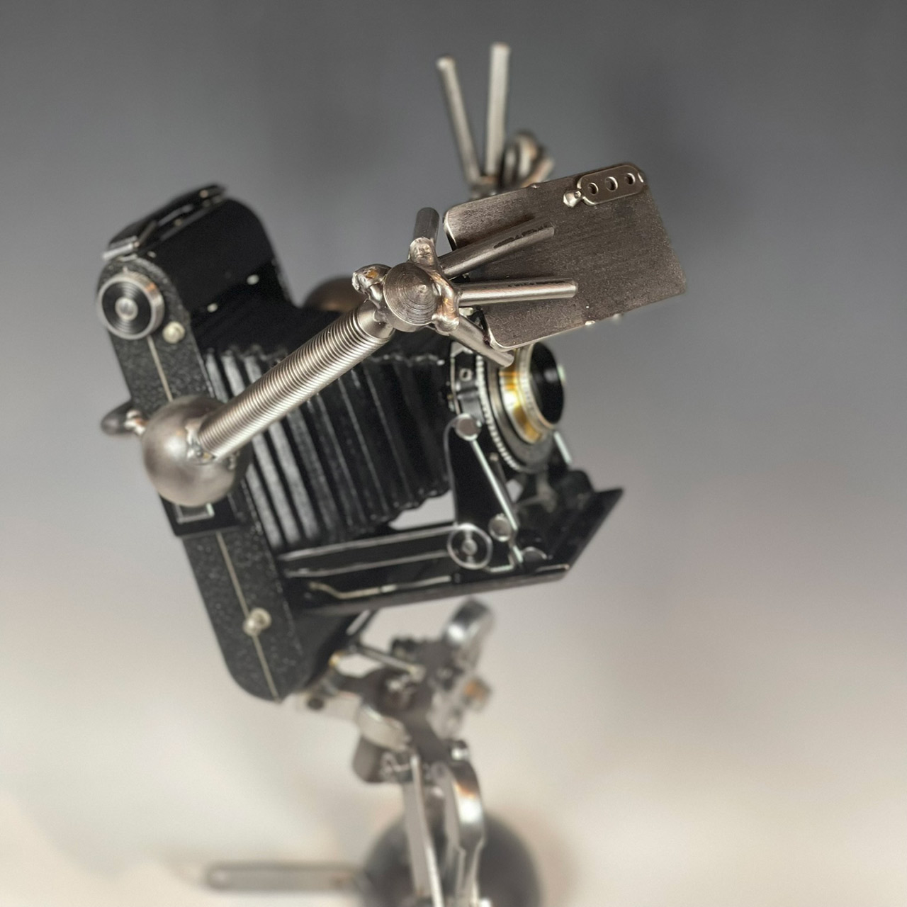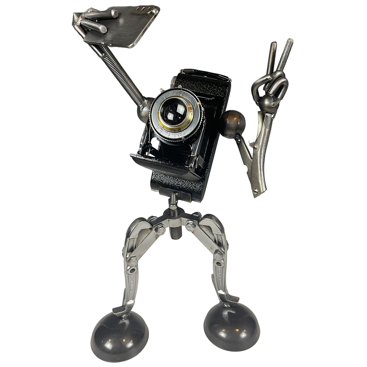 A playful fusion of past and present, this handcrafted metal sculpture features a vintage camera posed as if taking a selfie with a tiny cell phone. Made from metal and steel, it’s a quirky, one-of-a-kind piece that blends retro charm with modern humor — perfect for collectors, photographers, or anyone who loves unique decor. Stands freely — perfect for a shelf, desk, or gallery display.