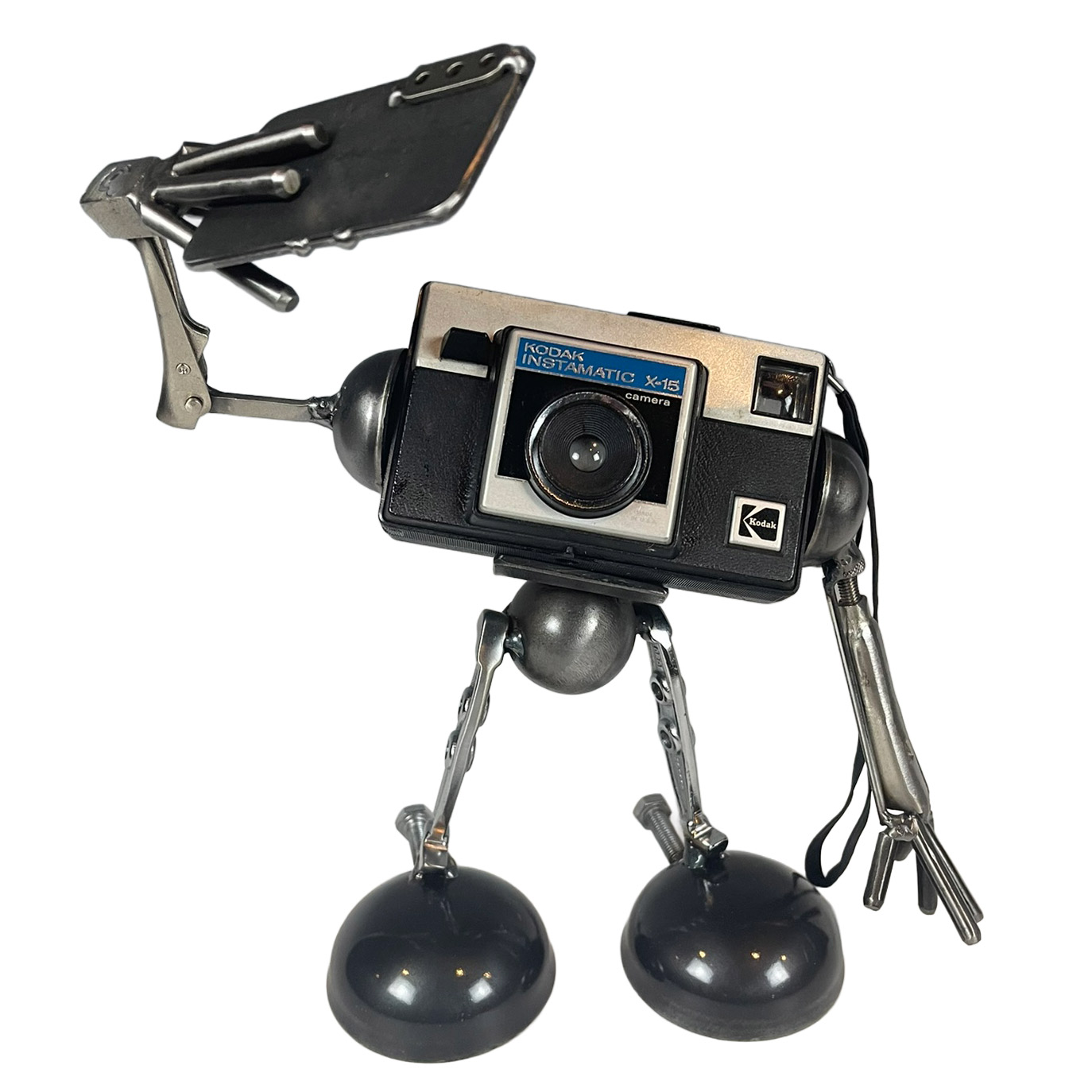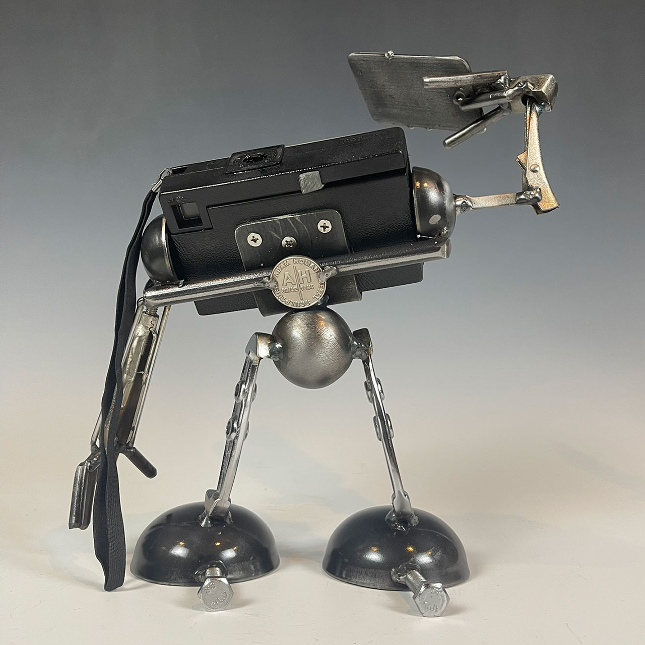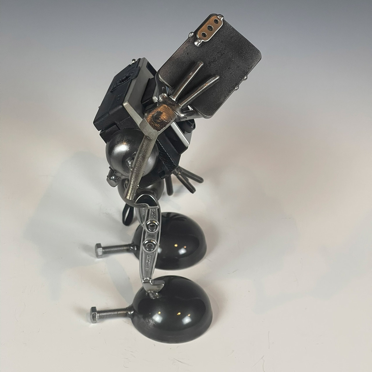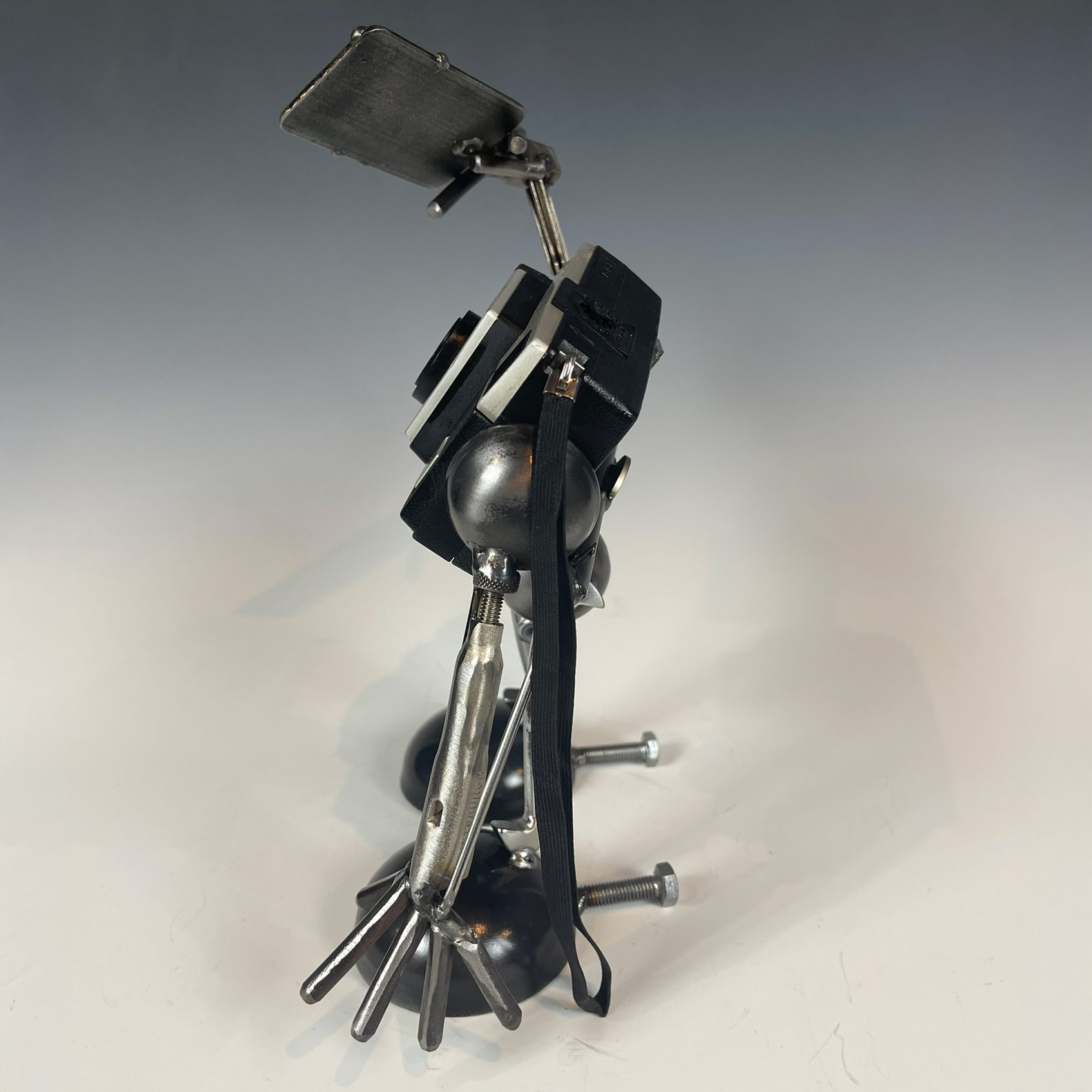 A playful fusion of past and present, this handcrafted metal sculpture features a vintage camera posed as if taking a selfie with a tiny cell phone. Made from metal and steel, it’s a quirky, one-of-a-kind piece that blends retro charm with modern humor — perfect for collectors, photographers, or anyone who loves unique decor. Stands freely — perfect for a shelf, desk, or gallery display.