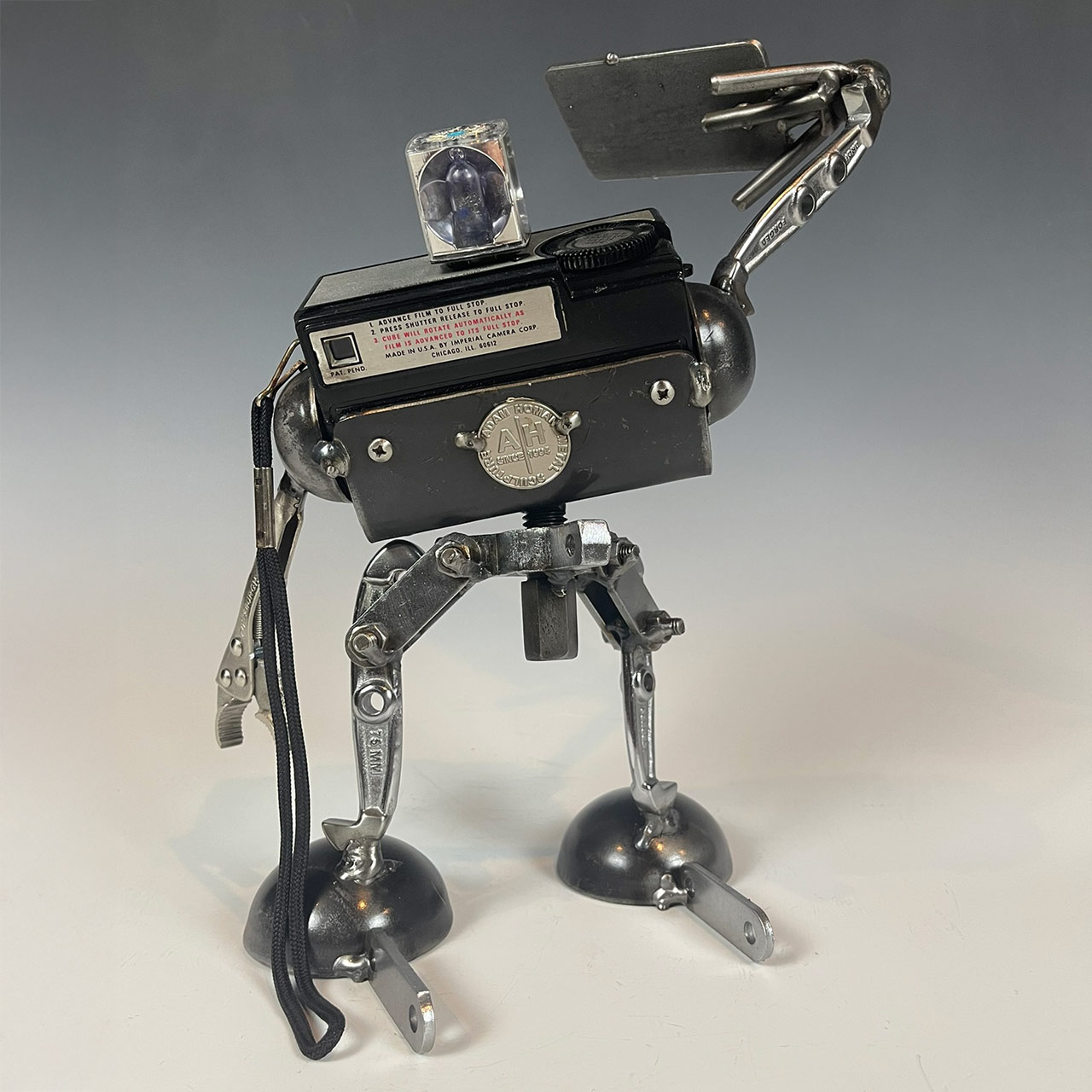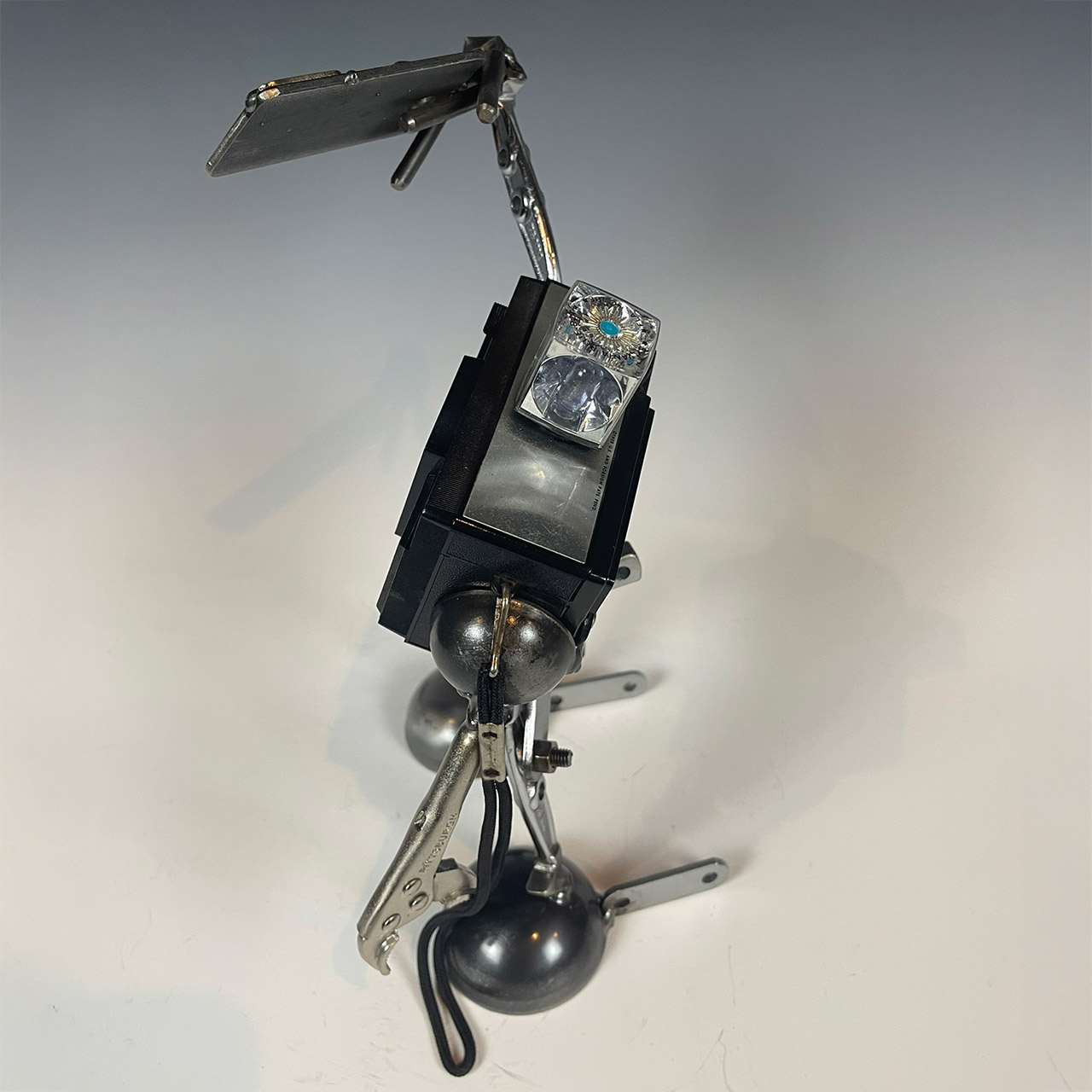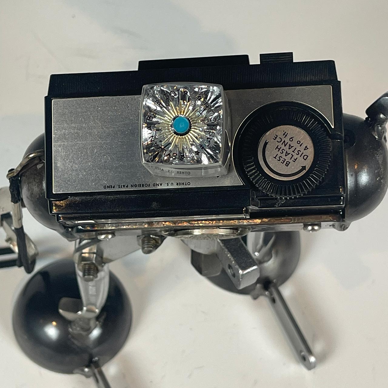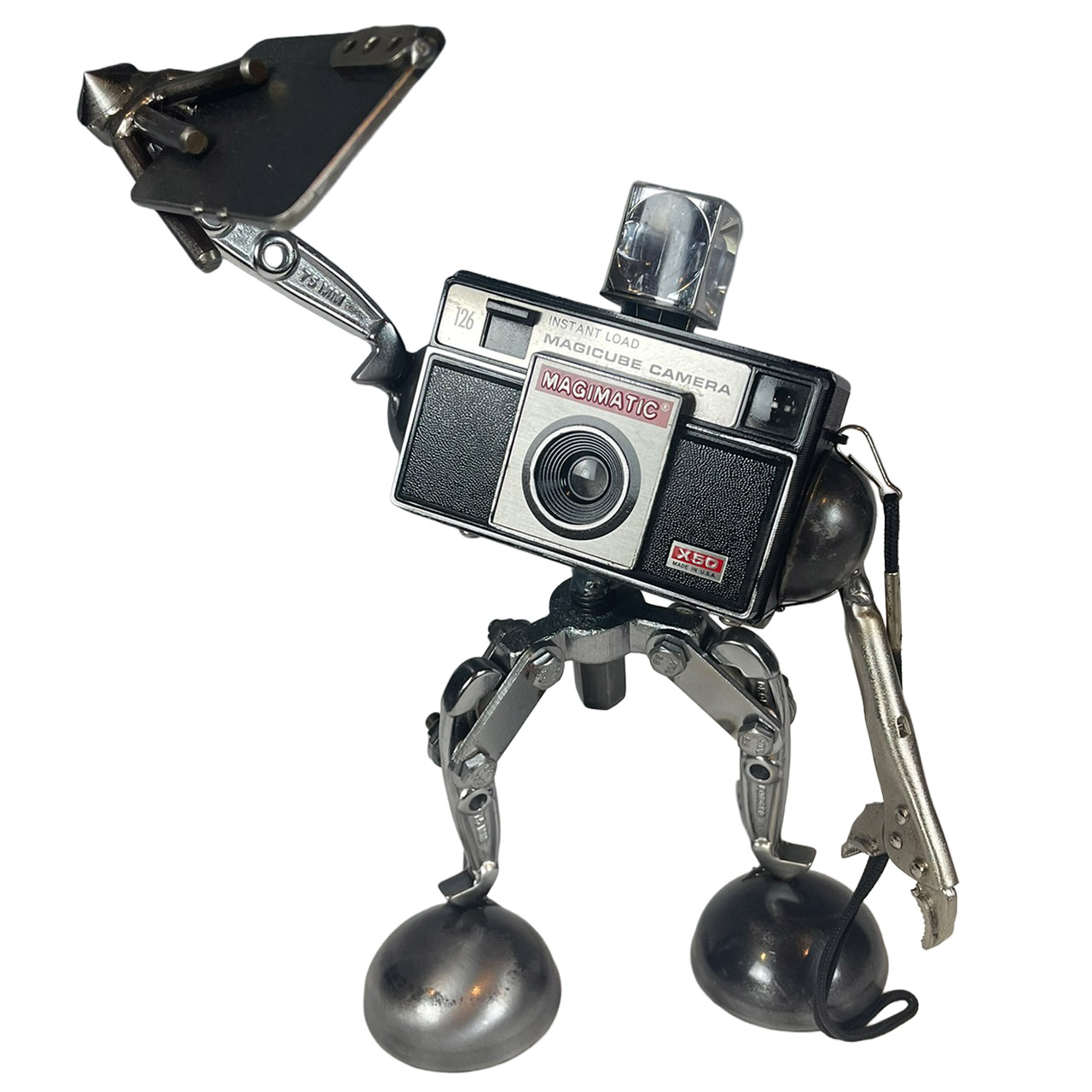 A playful fusion of past and present, this handcrafted metal sculpture features a vintage camera posed as if taking a selfie with a tiny cell phone. Made from metal and steel, it’s a quirky, one-of-a-kind piece that blends retro charm with modern humor — perfect for collectors, photographers, or anyone who loves unique decor. Stands freely — perfect for a shelf, desk, or gallery display.