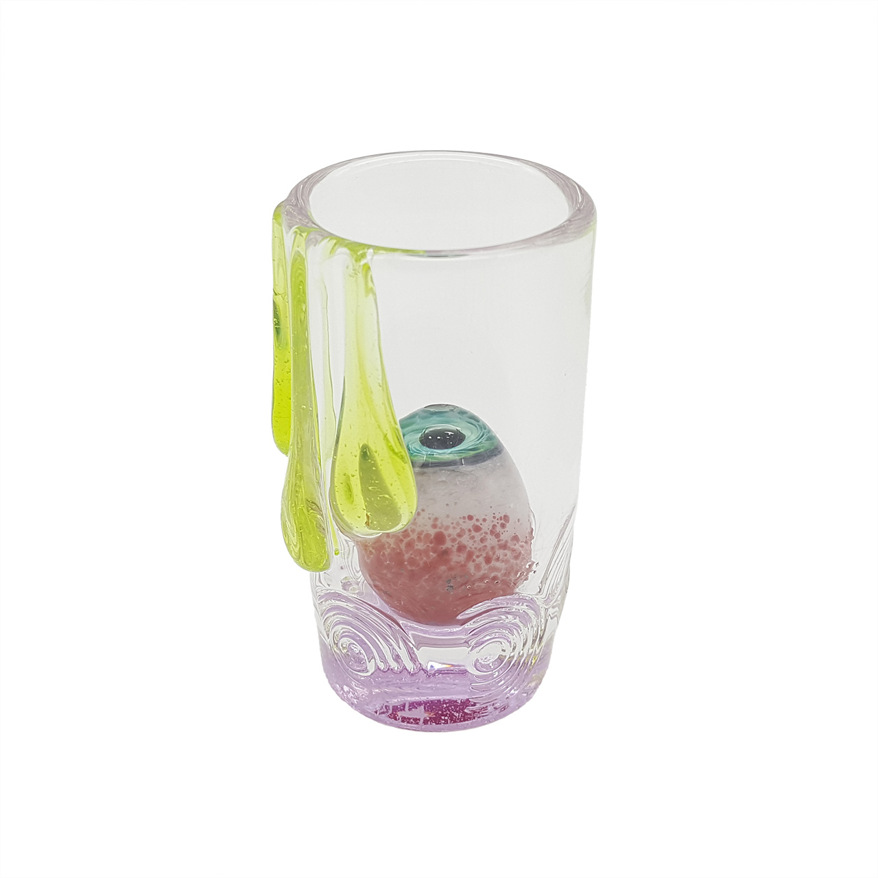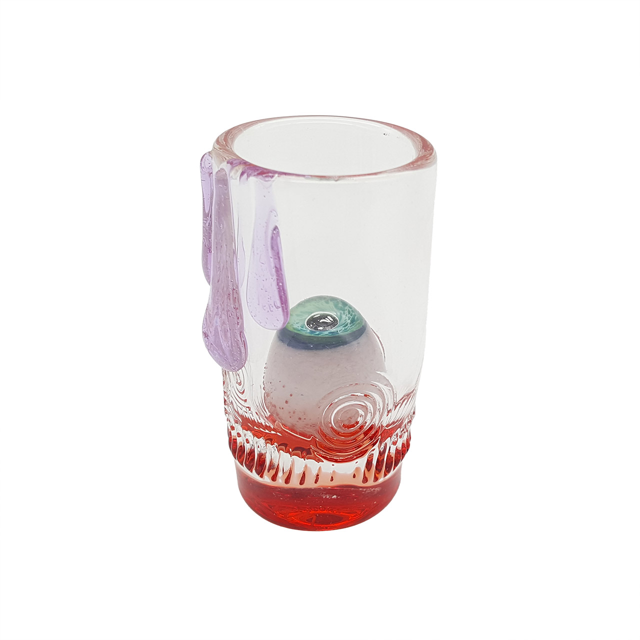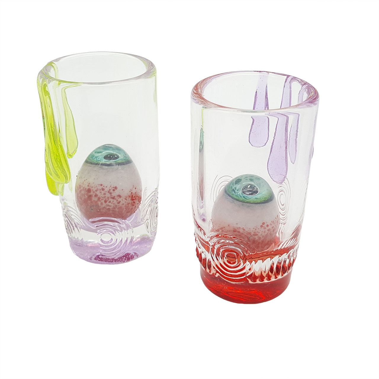 These eyeball shot glasses are designed with vividly colorful glass that has been heated and formed to shape. Artist Eli Mazet uses a multi-step processes creating a dimensional and intense aesthetic. The perfect addition to liven any barware collection.