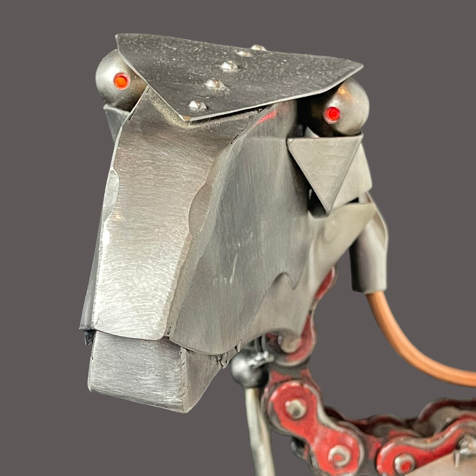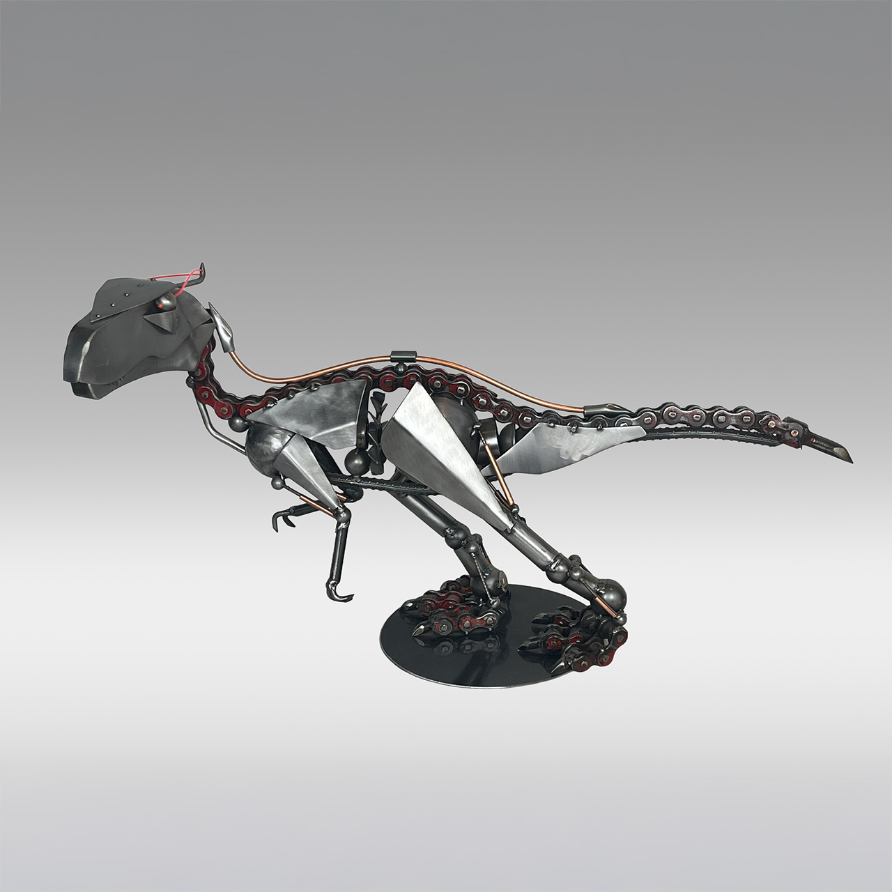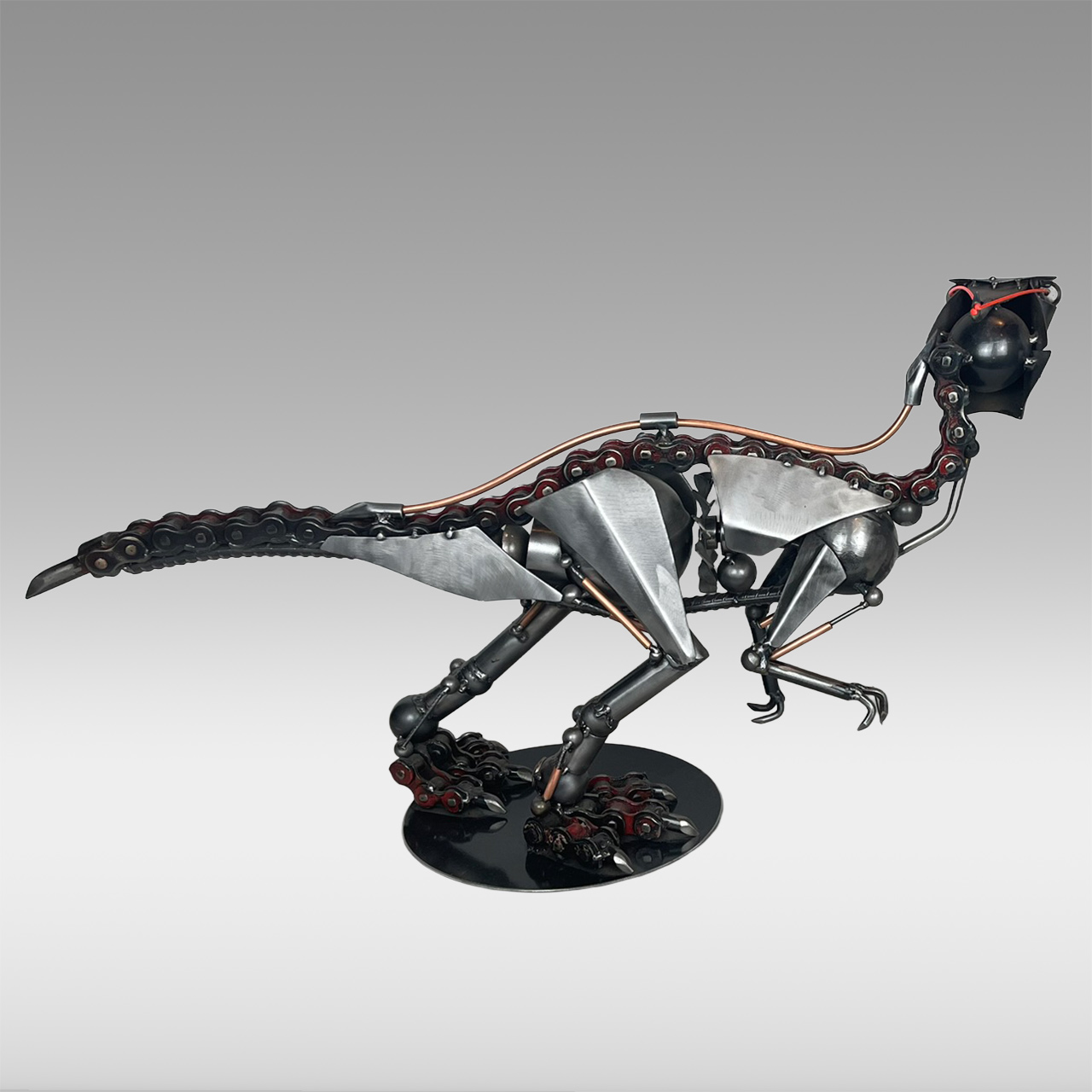 This magnificent sculpture is a breathtaking fusion of prehistoric ferocity and contemporary engineering. Crafted with astounding precision from repurposed bicycle chains, sheet metal, copper piping, and various mechanical components, this piece reimagines the iconic tyrannosaurus rex as a formidable cybernetic hunter. This has been meticulously articulated to show the dinosaur's powerful musculature and predatory stance, conveying a sense of imminent motion and primal energy.