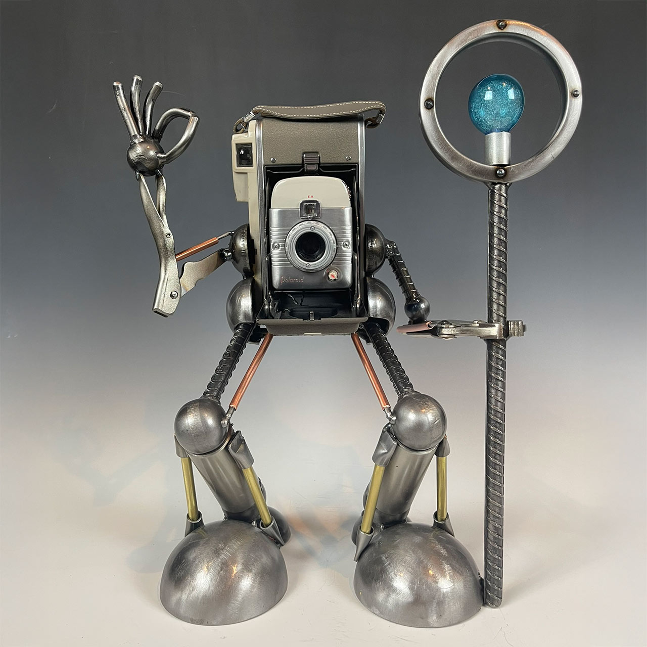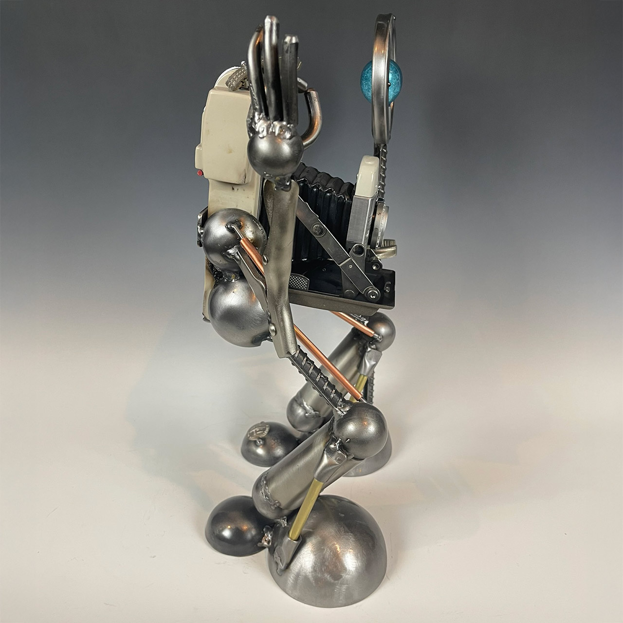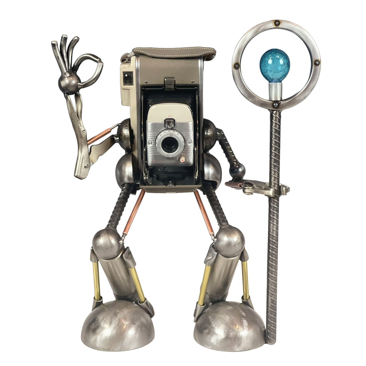 This whimsical little fellow is crafted with the body of a vintage camera with arms and legs crafted with a blend of steel and brass. One arm is raised in a leisurely “perfect” gesture while the other (made with a tool) is gripping a mini imagined photographer’s light. This sculpture embodies the magic of photography and the timeless joy of capturing memories.