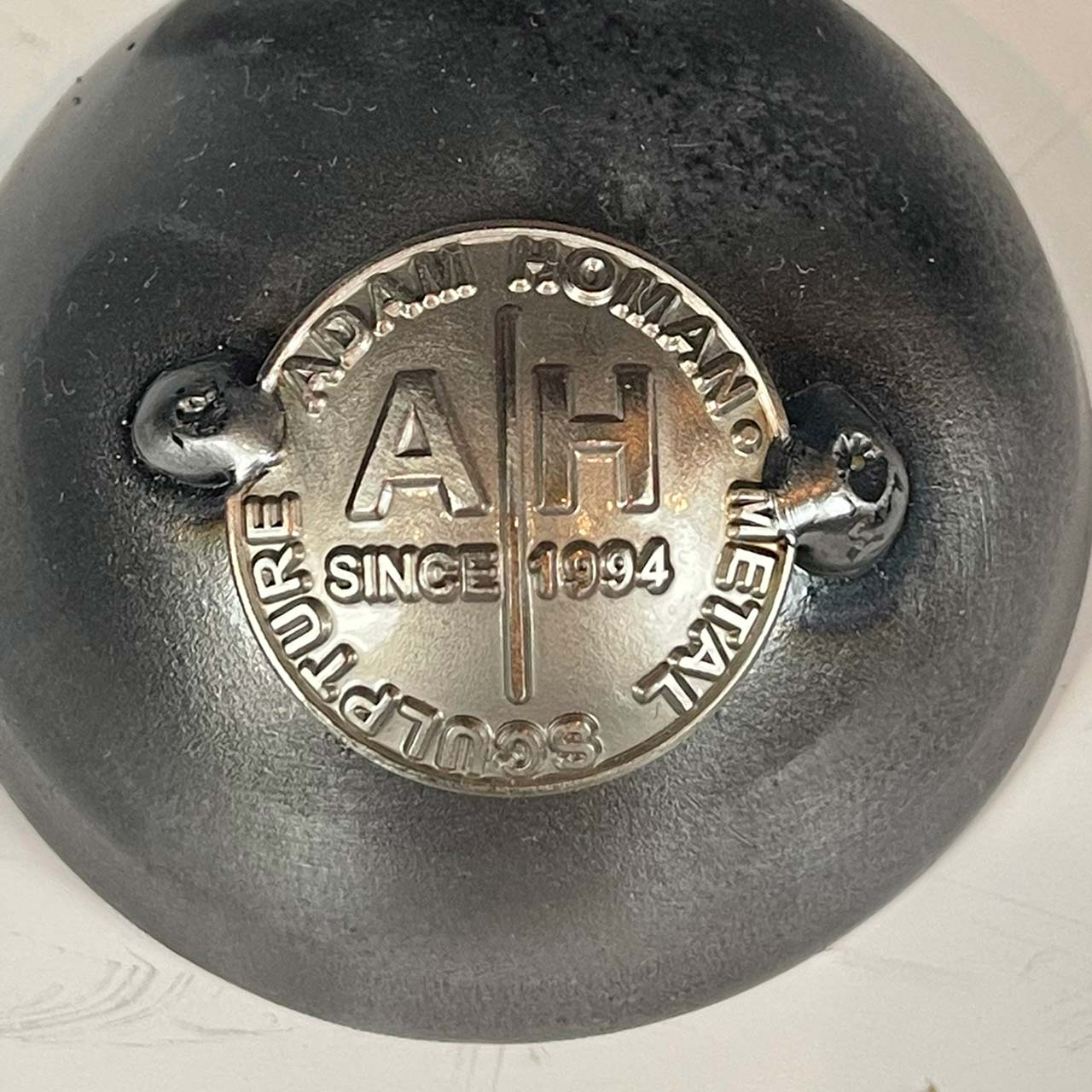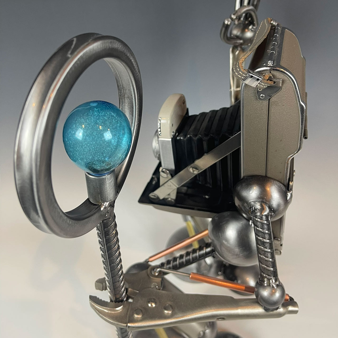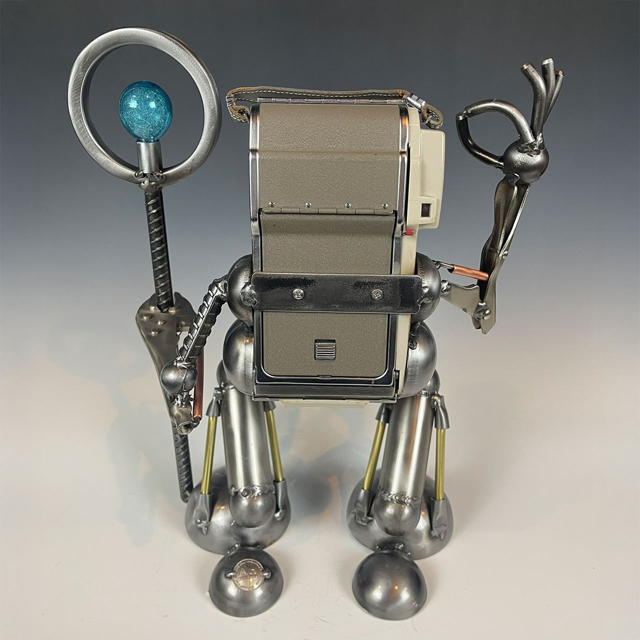 This whimsical little fellow is crafted with the body of a vintage camera with arms and legs crafted with a blend of steel and brass. One arm is raised in a leisurely “perfect” gesture while the other (made with a tool) is gripping a mini imagined photographer’s light. This sculpture embodies the magic of photography and the timeless joy of capturing memories.